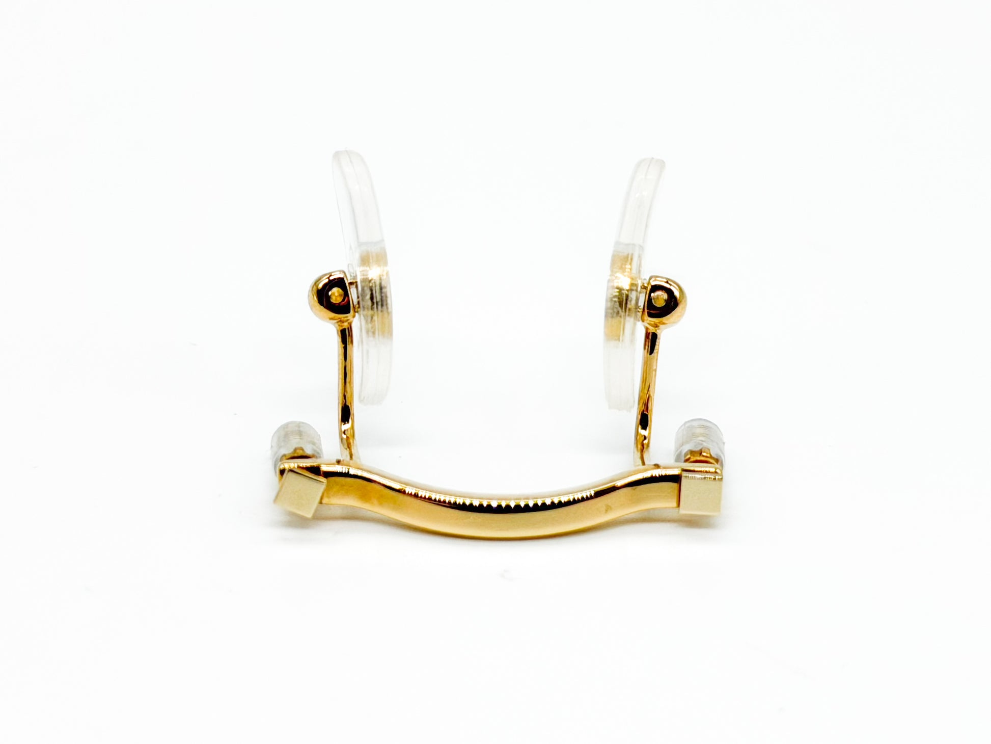 Gold-tone Cartier nose pad assembly featuring two clear comfort pads and integrated adjustable screw mounts. Designed for select Cartier optical frames as a complete pad/bridge unit—ideal for replacing a missing or damaged nose pad assembly (please verify compatibility).